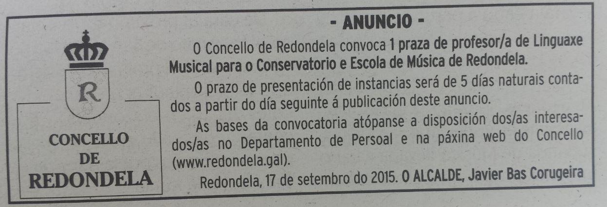 | Redondela | Profesor/a de Linguaxe Musical | 1 | Personal Laboral Fijo |  | |